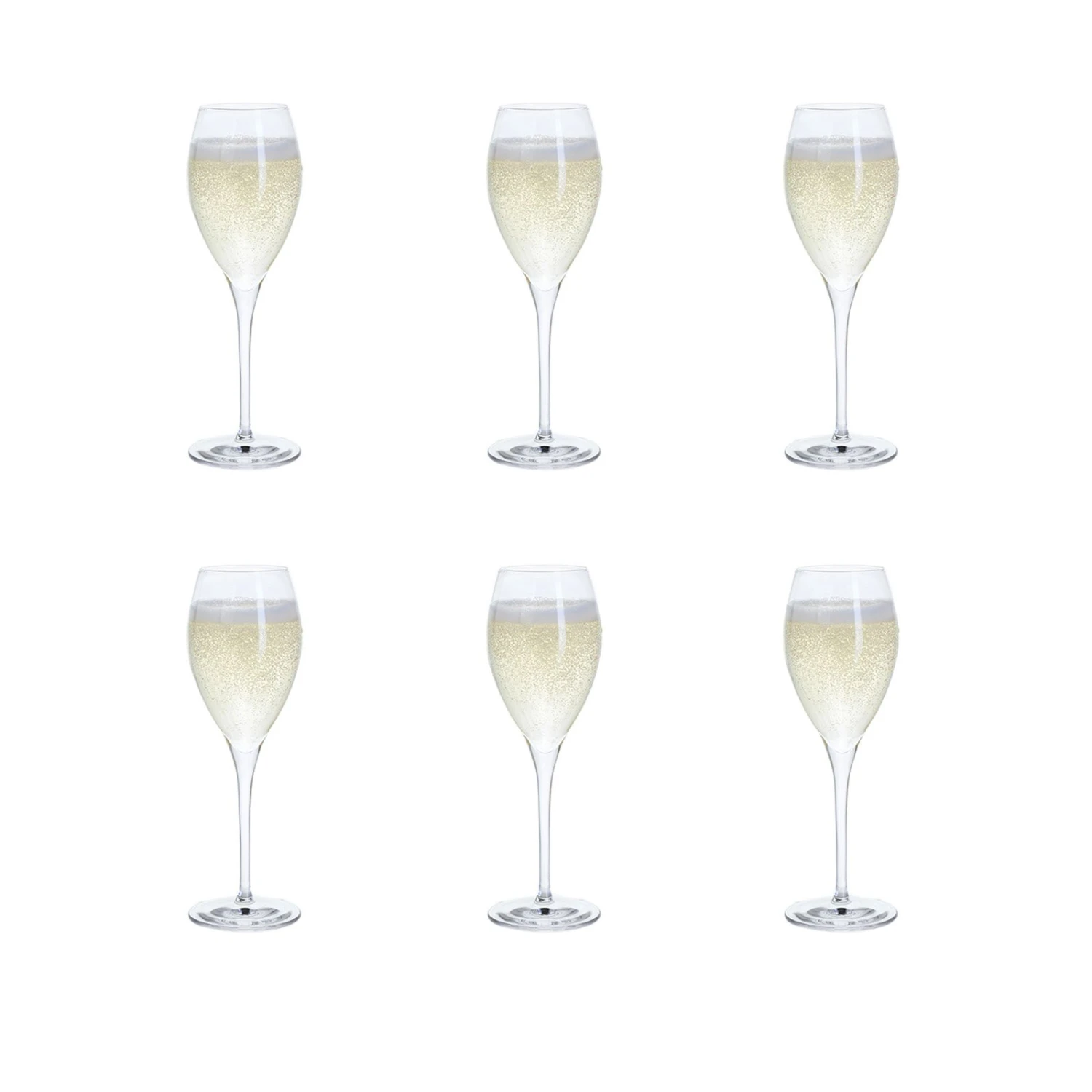 Impress guests and friends with a set of six prosecco glasses specially shaped for this popular Italian sparkling wine. Slightly shorter and wider than a traditional flute the shape of these prosecco flutes accentuates the flavours and carries a frothy head of bubbles. These stylish stems can also be used for serving Champagne and other sparkling wines. Great for your own Prosecco party or as a lovely gift idea. Dishwasher safe.